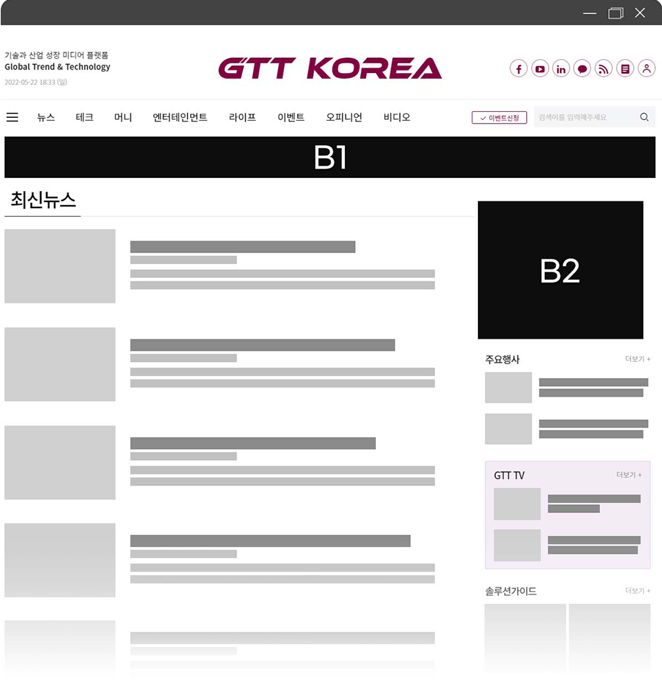 B1: 상단 배너 게재면 : 모든 섹션 페이지(섹션 아래와 세부 섹션 사이 광고) 사이즈 : 1180X 75 픽셀 가격 : 500만 원/월