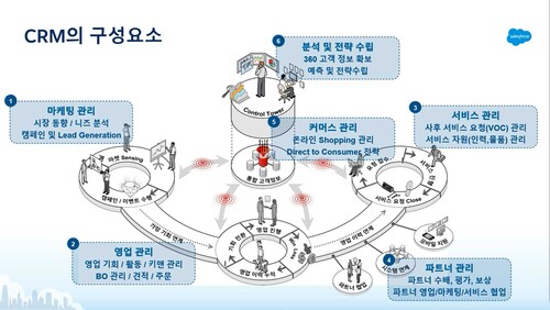 CRM을 활용할 수 있는 업무 영역은 단순히 마케팅에 국한되지 않는다. 마케팅, 세일즈, 커머스, 서비스, 데이터 분석 및 전략 수립, 파트너 관리 등 모든 비즈니스 업무 영역에서 CRM을 활용할 수 있다. 영업 기회를 포착하고, 견적과 주문 관리, 고객 VOC 수집 및 서비스 개선, 성과 분석 및 전략 수립까지 CRM의 단일 플랫폼 안에서 실현할 수 있다. 이 모든 프로세스의 중심은 바로 브랜드 충성도를 높이는 선순환을 이룰 수 있다.