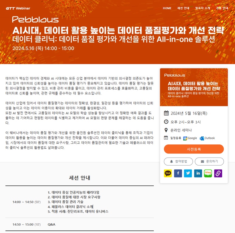 이 웨비나에서는 데이터 경제와 AI 시대에 조직과 기업에 가장 필요한 데이터 활용을 높이는 데이터 품질평가와 개선 전략을 제시한다. 이와 더불어 데이터 중심의 AI 패러다임, 시장에서의 데이터 품질에 대한 요구사항, 그리고 데이터 품질관리에 필요한 기술과 페블러스의 데이터 품질 평가와 개선에 필요한 올인원 솔루션 데이터 클리닉 솔루션의 다양한 산업별 분야별 활용법도 자세히 살펴본다.