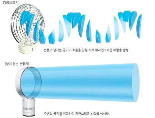 바람을 만드는 방식이 다르기 때문에 날개에 있는 선풍기와 날개 없는 선풍기는 바람의 품질이 다르다. 날개 있는 선풍기는 뒷부분의 공기를 빠르게 날개로 잘라서 앞으로 밀어주는 방식이다. 반면에 날개 없는 선풍기는 공기의 흐름을 끊지 않고 이동시켜서 훨씬 자연스러운 바람을 만들어준다. 날개 있는 선풍기 앞에서 소리를 내면 ‘아.아.아.아’ 하고 떨리는 것처럼 들리는 것도 바로 공기의 흐름이 단절되기 때문이다.