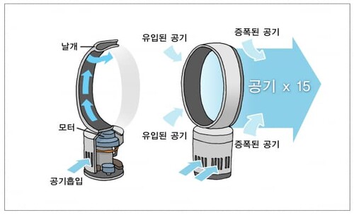 다이슨 제품의 경우 초당 약 27L의 공기를 빨아들인다. 일반 선풍기가 빨아들이는 공기량의 약 3배에 달한다고 한다. 이렇게 빨아들여진 공기는 위쪽에 둥근 고리의 내부로 밀어 올려지는 데 이 고리의 공간이 당연히 밑에 있는 원기둥보다 훨씬 좁다. 그래서 속으로 빨려 들어간 공기는 유속이 시속 90km 정도로 매우 빨라지게 된다. 빨라진 공기는 비행기 단면 모양의 벽을 타고 고리 안쪽면에 나 있는 작은 틈을 통해 빠른 속력으로 배출된다. 빠른 공기의 흐름은 고리 안쪽의 기압을 낮아지게 만든다. 고리 안쪽의 기압이 낮아지면 당연히 주변의 공기들이 고리 안쪽으로 몰려들게 된다. 그래서 강한 공기의 흐름이 만들어지는 것이다. 마치 강제로 빌딩풍을 만들어 내는 것과 같다. 이 과정에서 고리를 통과하는 공기의 양은 기둥으로 빨려 들어간 공기보다 약 15배 정도 증가한다. 그래서 다이슨은 이 같은 기술에 공기를 증폭한다는 뜻의 에어멀티플라이어라는 이름을 붙인 것이다.