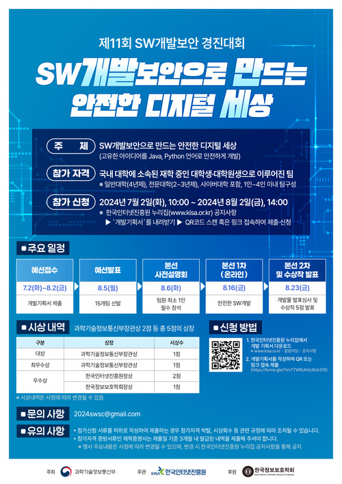 한국인터넷진흥원(원장 이상중, 이하 ‘KISA’)은 과학기술정보통신부(장관 이종호, 이하 ‘과기정통부’)와 함께 ‘제11회 소프트웨어 개발보안 경진대회’를 개최한다고 2일 밝혔다.