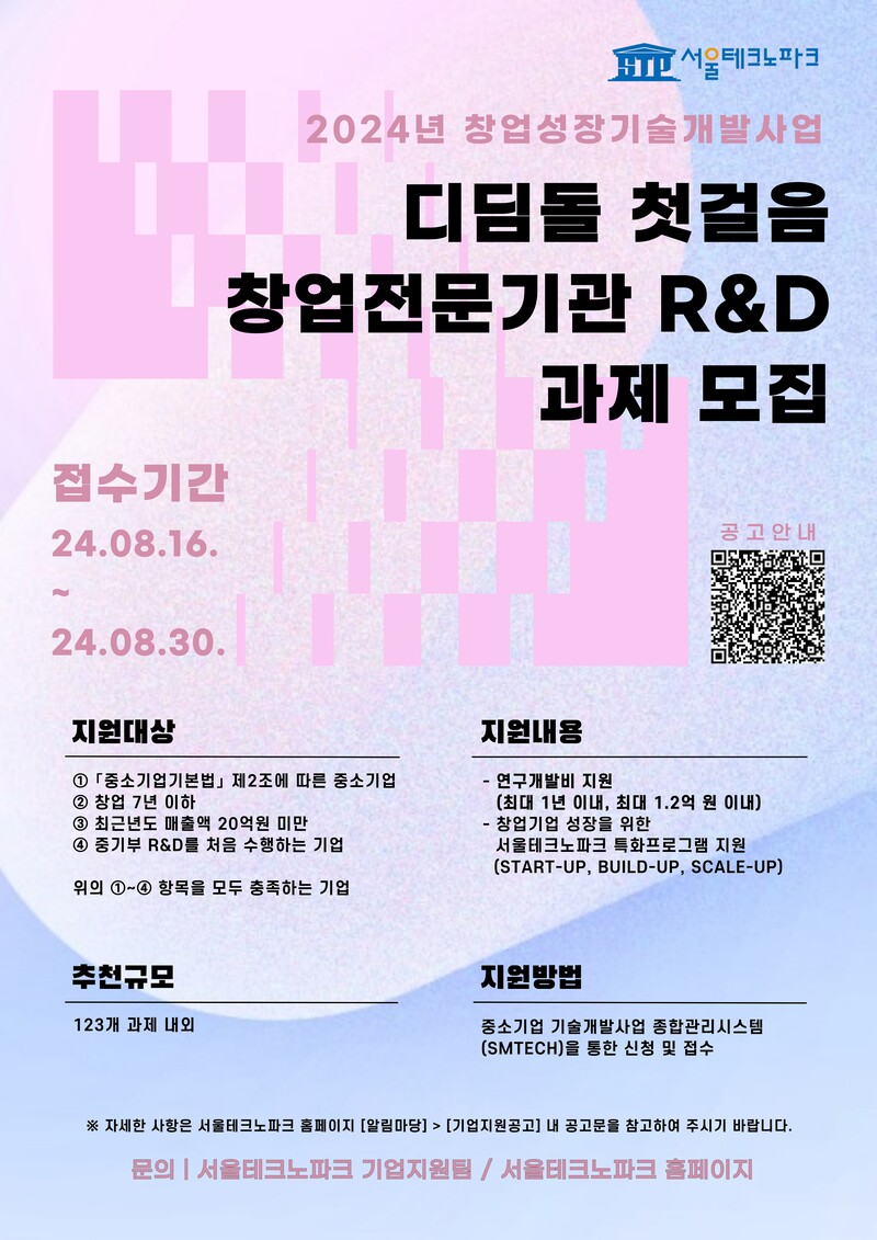 신 산업 육성 기업 서울테크노파크(원장 윤종욱, 이하 서울TP)가 ‘2024년 창업성장기술개발사업’의 일환으로 ‘디딤돌 첫걸음 기술창업기관의 연구개발 과제’를 모집한다고 23일 밝혔다.