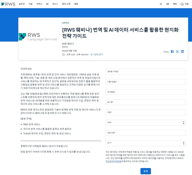 이번 웨비나에서는 RWS만의 차별화된 번역 서비스와 AI 개발을 위해 효율적으로 구조화된 데이터 수집, 콘텐츠 제작 및 데이터 서비스가 소개된다.