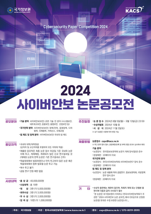 국가사이버안보센터가 국가정보원(원장 조태용)이 한국사이버안보학회(KACS, 학회장 김상배)가 주관하는 ‘2024 사이버안보 논문공모전’에서 지난 8월 5일부터 오는 9월 13일 까지 논문을 접수받는다고 29일 전했다.