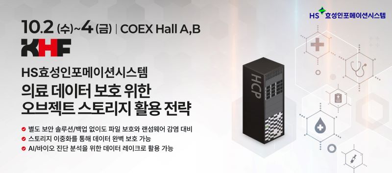 AI∙데이터 인프라 솔루션 전문기업 HS효성인포메이션시스템(대표 양정규)이 10월 2일부터 4일까지 열리는 디지털 헬스케어 박람회 ‘KHF(국제 병원 및 헬스테크 박람회) 2024’에서 랜섬웨어 대응 및 PACS(의료영상저장전송시스템) 시스템 이중화 등 의료 데이터 보호 위한 오브젝트 스토리지 활용 전략을 제시하며 의료산업 사업 확대에 박차를 가한다.