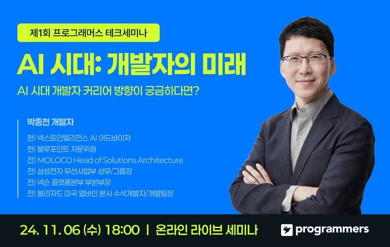 이번 세미나에서는 주요 연사로 30년 경력의 개발자이자 <챗GPT 시대 살아남기> 저자 박종천 넥스트인텔리전스 AI 고문이 참여한다. 박고문은 실리콘밸리와 여러 글로벌 기업에서 쌓은 경험을 바탕으로 AI 기술이 빠르게 확산되는 시대에 개발자로서 경쟁력 유지를 위해 필요한 역할, 커리어 방향 및 AI의 효과적 활용 방법 등을 소개할 예정이다.