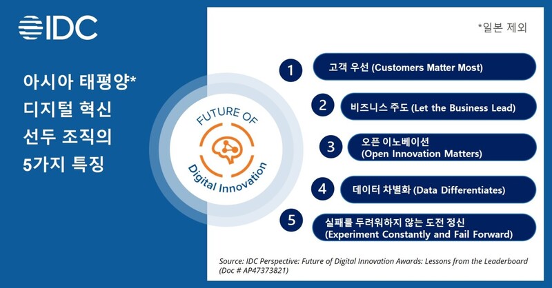 IDC는 퓨처 엔터프라이즈 어워드 수상 사례를 바탕으로 조직의 성공을 위한 필수 가이드를 제시했다. ‘미래의 디지털 혁신’ 부문에서 선두적인 퍼포먼스를 보여준 조직의 특징은 ▲고객 우선 ▲비즈니스 주도 ▲오픈 이노베이션 ▲데이터 차별화 ▲실패를 두려워하지 않는 도전 정신 등 5가지이다.