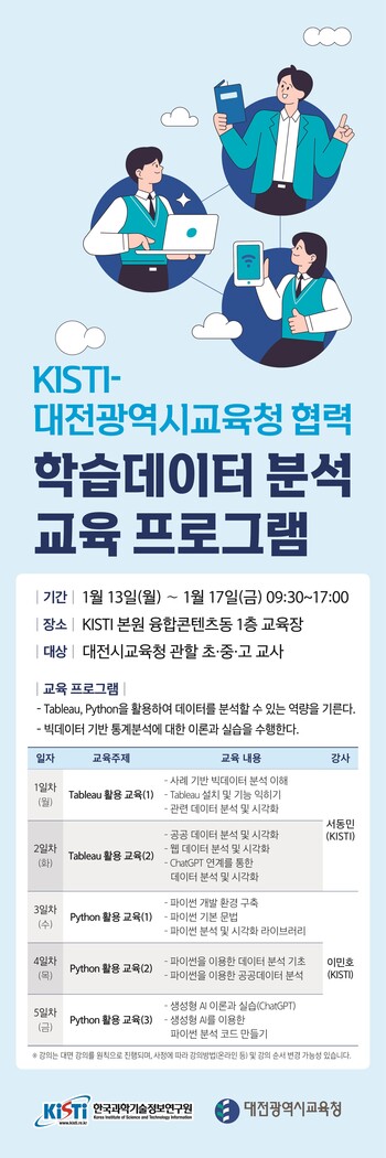 한국과학기술정보연구원(원장 이식, 이하 KISTI)이 대전시교육청과 협력해 ‘학습데이터 분석 교육 프로그램’을 오는 1월 13일부터 17일까지 진행한다고 10일 밝혔다.
