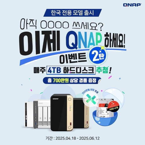 컴퓨팅, 네트워킹 및 스토리지 전문 기업 큐냅 코리아(QNAP Korea)가 한국 전용 NAS 모델 구매 고객을 대상으로 6월 12일까지 프로모션 2탄을 진행한다고 발표했다. 이번 이벤트는 총 700만 원 상당의 경품 추첨으로, 참여 고객 중 매주 추첨을 통해 Seagate 아이언울프 4TB 하드디스크를 제공한다.