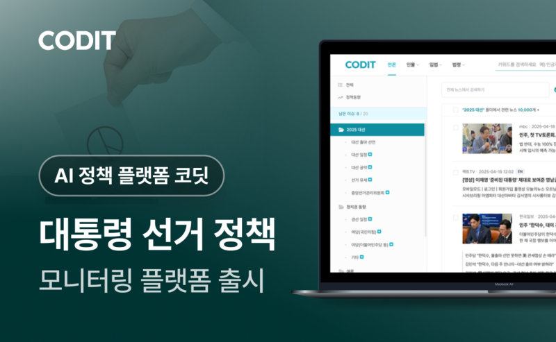코딧이 대통령 탄핵 인용 이후 조기 대선 체제 전환이 본격화되면서, 국내외 기업과 기관이 급변하는 정치·입법 환경에 선제적으로 대응할 수 있는 ‘2025 대통령 선거 정책 모니터링 플랫폼’을 출시했다고 29일 밝혔다.