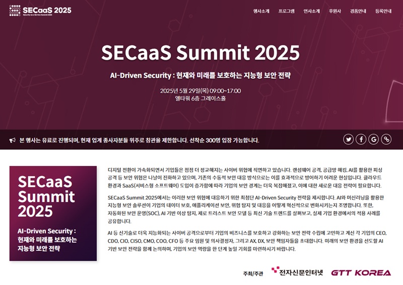 - AI로 진화하는 사이버 보안, 위협과 대응 전략 총망라...‘SECaaS Summit 2025’ 5월 29일 개최