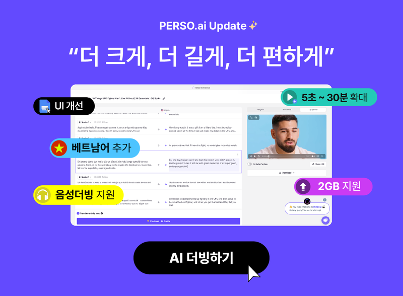 이번 업데이트로 페르소닷에이아이를 활용해 초단편에서 장편까지 다양한 길이의 영상을 더빙할 수 있게 됐다. 기존에 지원했던 길이는 20초에서 20분까지, 1GB의 영상이었는데, 이를 5초에서 30분까지로 늘리고 용량도 두 배인 2GB로 확장했다.