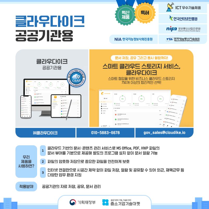 클라우다이크는 자사의 공공기관용 스마트 클라우드 스토리지 서비스가 정부로부터 ‘혁신제품’으로 지정됐다고 9일 밝혔다. 이번 지정은 공공업무 환경에 최적화된 클라우다이크 솔루션의 기술력과 기능을 정부가 공식적으로 인정한 결과다.
