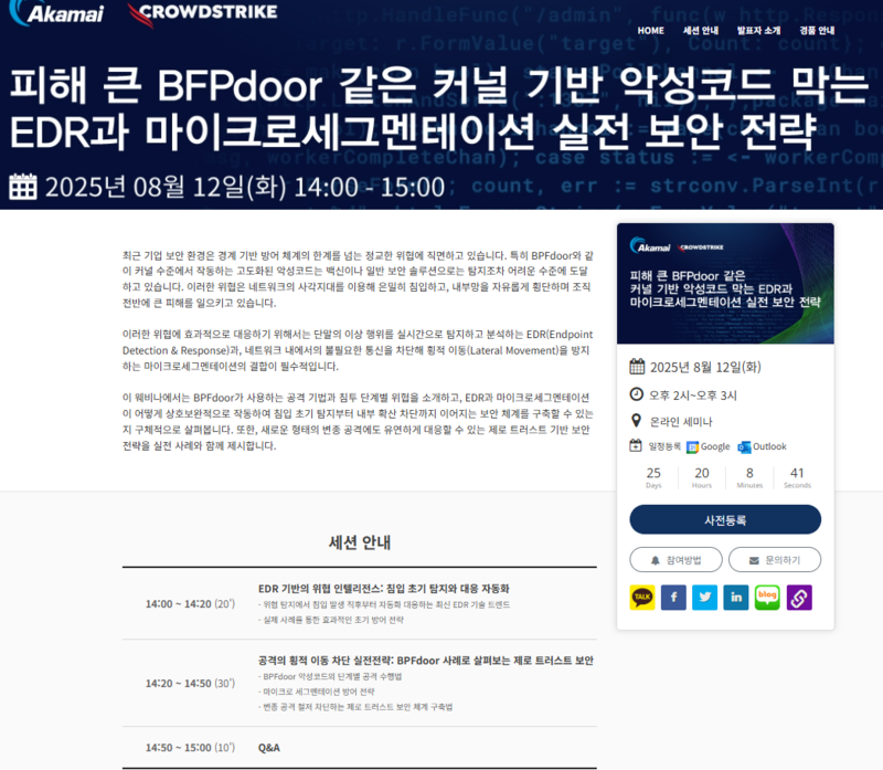 - “BPF Door 막는 실전 보안, EDR과 마이크로세그멘테이션으로 구축하는 제로트러스트 전략” 무료 웨비나 8월 12일