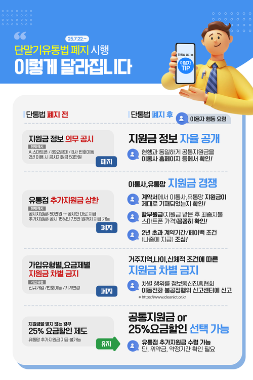 과학기술정보통신부(장관 배경훈, 이하 ‘과기정통부’)와 방송통신위원회(위원장 이진숙, 이하 ‘방통위’)가 2014년 도입된 단통법이 오는 22일 폐지되고 ‘전기통신사업법’ 개정안이 시행된다고 18일 밝혔다.
