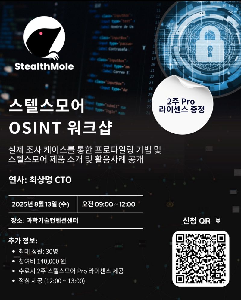 사이버 위협 인텔리전스 전문기업 스텔스모어(Stealthmore)는 8월 13일 수요일 과학기술컨벤션센터에서 ‘스텔스모어 제품 소개 및 활용 사례’를 주제로 오프라인 워크샵을 개최한다고 밝혔다. 이번 워크샵은 사이버 보안 실무자 및 위협 인텔리전스 분야에 관심 있는 관계자들을 대상으로 하며, 자사 플랫폼을 활용한 실제 분석 사례와 대응 방안을 중점적으로 소개한다.