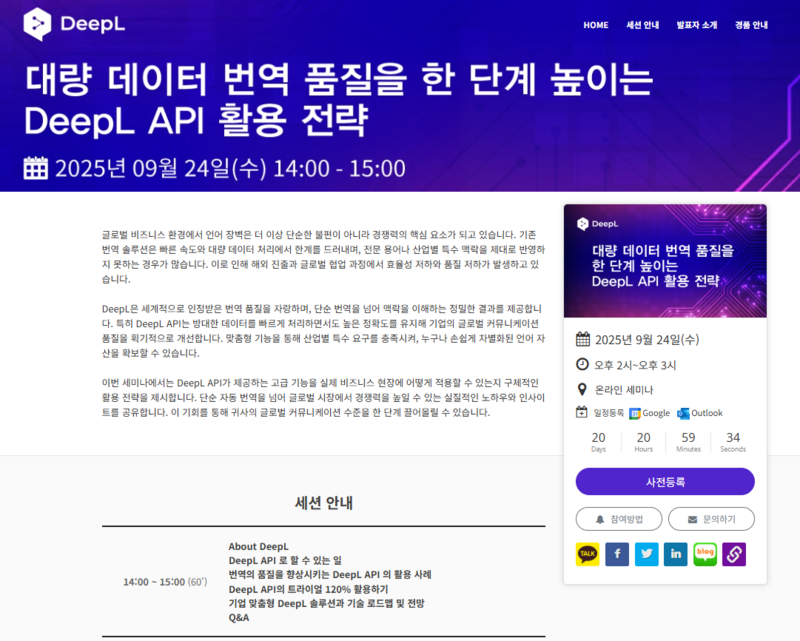 이번 웨비나는 글로벌 시장 진출을 준비하거나 이미 해외 법인 및 파트너와 협업 중인 기업, 다국어 문서를 대량 처리해야 하는 제조, 금융, 공공, 전문 서비스 분야 담당자에게 특히 유익하다. 참가자는 고품질 번역 API의 실제 적용 전략을 학습하고, 효율적이고 차별화된 글로벌 커뮤니케이션 역량을 확보할 수 있는 인사이트를 얻게 될 것으로 기대된다.