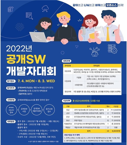 올해로 16회를 맞는 ‘공개SW 개발자대회’는 국내 공개소프트웨어 개발자의 발굴 및 육성을 목적으로 매년 개최되고 있다. 올해는 7월 4일부터 8월 3일까지 정보통신산업진흥원의 공개SW포털에서 대회 참가자를 모집한다.