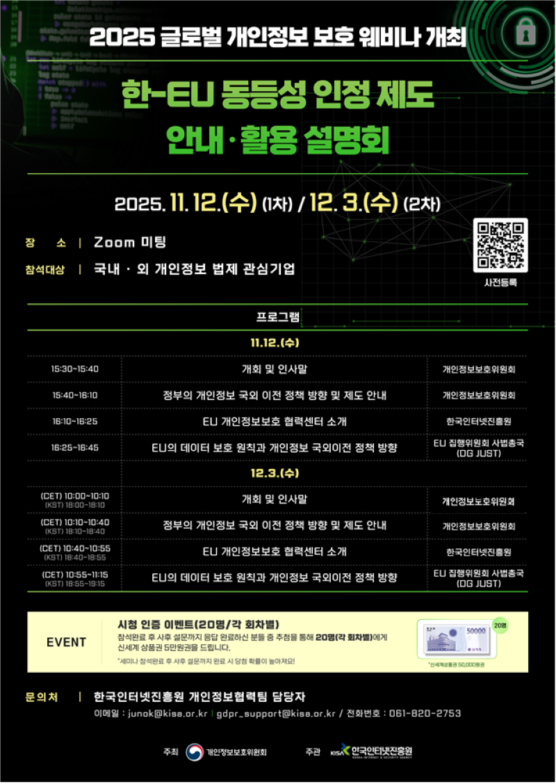 한국인터넷진흥원(KISA, 원장 이상중)은 개인정보보호위원회(위원장 송경희, 이하 개인정보위)와 함께 ‘한·유럽연합(EU) 동등성 인정 제도 온라인 설명회’를 개최한다고 2025년 11월 5일 밝혔다. 이번 설명회는 한·EU 간 안전하고 자유로운 개인정보 이전 체계가 구축된 것을 기념하고, 관련 제도에 대한 기업의 이해를 돕기 위해 마련됐다.