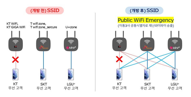 '재난와이파이'는 재난 상황에서 이용자가 개방여부를 쉽게 인지할 수 있도록 공통식별자(Public WiFi Emergency)를 송출하고 재난문자로 안내하는 것으로, 일부 사업자는 와이파이 식별자 전환을 자동화하기 위해 시스템을 연말까지 추가로 개선할 계획이다.