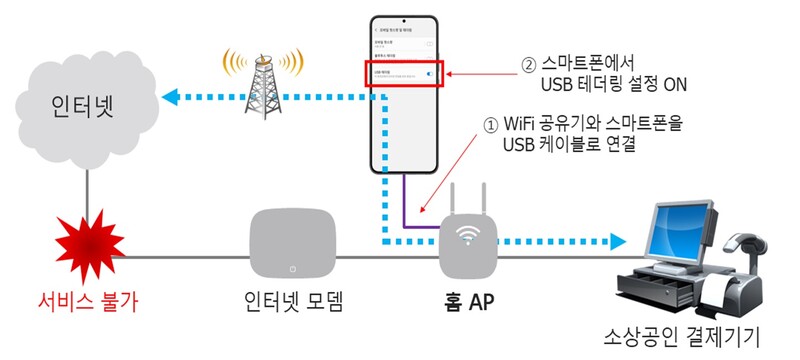 유선 인터넷 장애 상황에서 결제불가로 인한 소상공인 피해가 발생할 경우에 대비해, 유선3사는 휴대폰 테더링 기능을 이용한 결제기기(POS기기, 카드결제기)의 긴급결제가 가능하도록 지원한다.