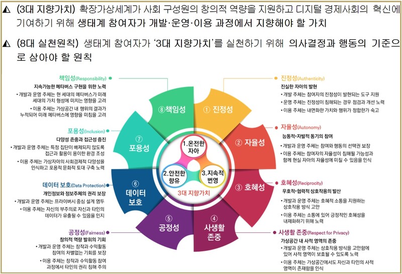 과기정통부는 이러한 확장가상세계에 대한 사회적 우려를 해소하고, 국가 신성장 동력으로써 메타버스의 잠재력과 확장성이 제한받지 않도록 관계부처와 산업계를 중심으로 메타버스의 개발・운영・이용 과정에서 메타버스 생태계 참여자가 지켜야할 규범을 마련하고 있다.