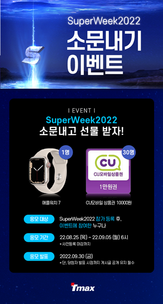 티맥스는 슈퍼위크 2022의 사전 프로모션으로 사전 등록 마감일인 9월 5일까지 소문내기 이벤트를 진행한다. 행사 공식 홈페이지에서 사전 등록한 다음 블로그에 슈퍼위크 홍보를 하고, 이벤트 참여를 신청하면 된다. 추첨을 통해 스마트 워치, 모바일 상품권 등의 상품이 제공된다. 사전 등록만 해도 추첨을 통해 기프티콘을 받을 수 있다.