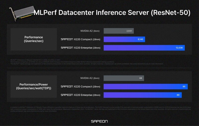 사피온 X220은 경쟁제품인 엔비디아의 최신 GPU, A2 대비 약 2.3배 빠른 처리 성능을 기록하는 등 높은 성능을 입증 받았다.