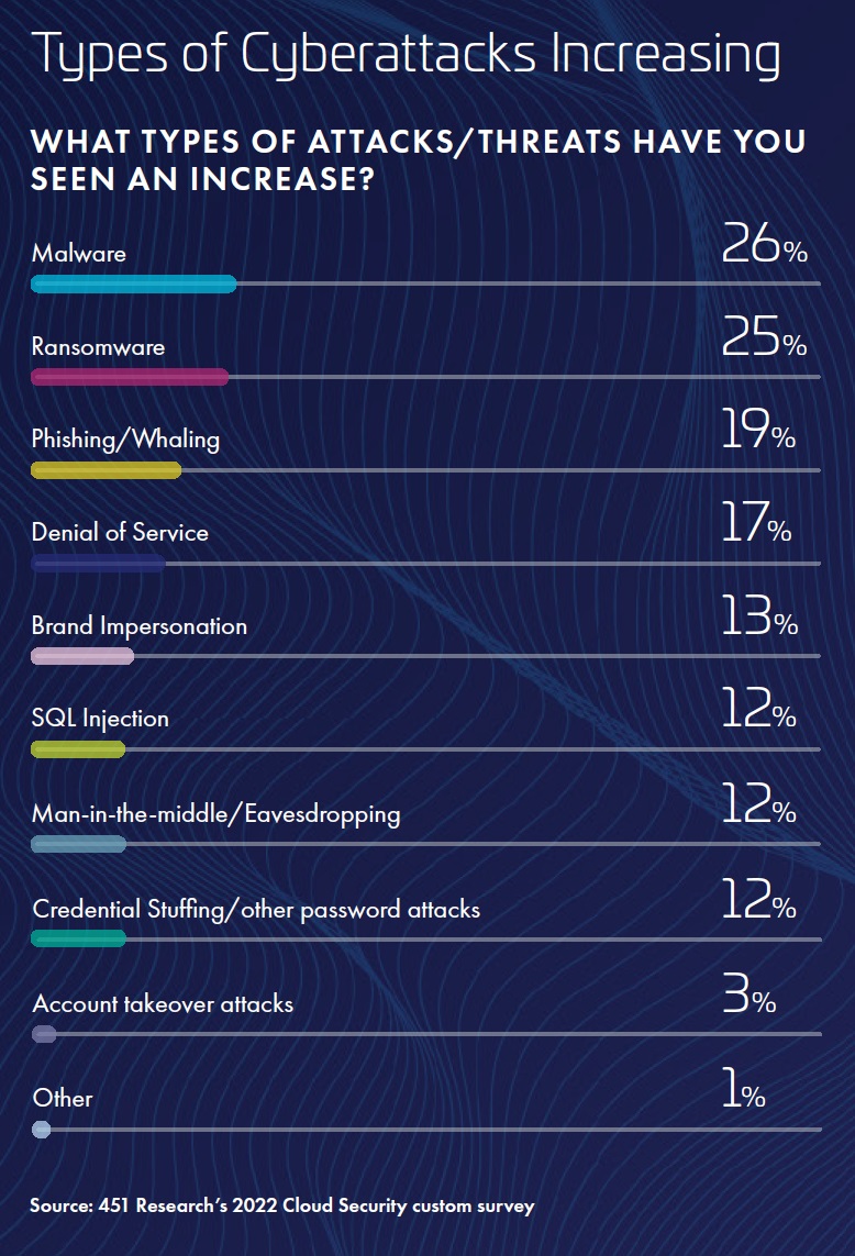 사이버 공격은 클라우드 애플리케이션과 데이터에 계속적으로 위협이 되고 있다. 특히 응답자 중 26%는 멀웨어를 선택했으며, 25%는 랜섬웨어, 19%는 피싱/웨일링이 증가했다고 답했다.