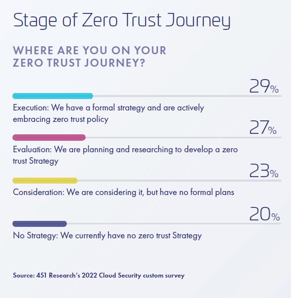 게다가 기업들이 제로 트러스트나 이와 관련된 투자를 하고 있는 현상은 고무적이다. 한국 응답자 약 1/4(24%)은 이미 제로 트러스트 전략을 시행 중이라고 답했고, 1/3(35%)은 평가 및 계획 중이며 1/4(25%)은 현재 고려 중이라고 답했다. 이는 긍정적인 조사결과로 아직까지 제로 트러스트가 국내에서 좀 더 반영될 여지가 있음을 나타냈다.