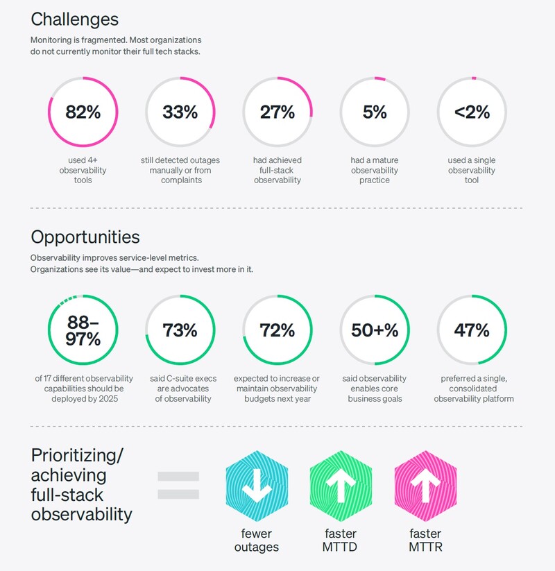 보고서의 핵심 내용 중 많은 데이터가 풀스택 옵저버빌리티를 구축하거나 옵저버빌리티를 우선순위에 두는 것이 더 적은 시스템 중단, 시스템 중단 감지율 향상, 해결방안 개선 등과 긴밀한 상호관계가 있음을 보여주고 있다. 예를 들어, 풀스택 옵저버빌리티를 구축했거나 우선시하고 있다는 응답자의 34%는 그렇지 않다고 대답한 52%보다 비즈니스에 큰 영향을 주는 시스템 중단 빈도(1주일에 1회 이상)를 덜 경험했다. 또한, 이미 풀스택 옵저버빌리티를 확보했거나 우선시하고 있다는 응답자의 68%는 그렇지 않은 44%의 응답자보다 비즈니스에 큰 영향을 주는 시스템 중단을 감지하는 데 30분을 덜 소비했다.