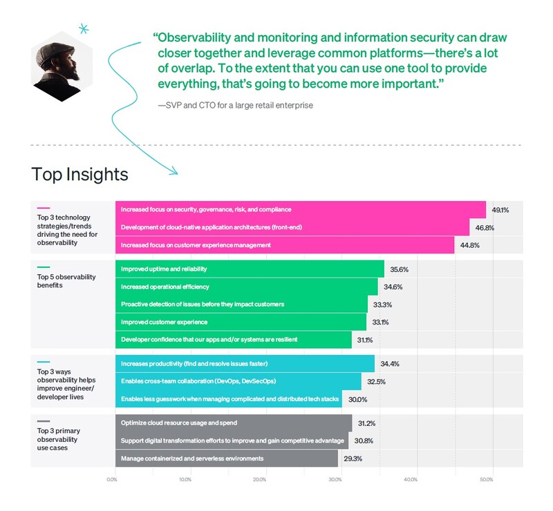 보고서에 따르면 오늘날 기업은 다양한 툴을 조합해 자사 기술 스택을 모니터링하고 있는 반면, 응답자들은 큰 규모의 프로젝트 완수를 위해 더욱 단순하고, 통합적이고, 매끄럽고, 효율적인 방안을 찾고 있다. 이에 더해 현재 많은 기업이 최고의 고객 경험 제공을 위해 블록체인이나 에지 컴퓨팅, 5G와 같이 기술 활용에 집중하는 상황에서 옵저버빌리티가 기업의 혁신을 지원하고 업타임과 안정성을 확보를 위한 배포 관리 방식을 더욱 용이하게 한다고 답변했다.