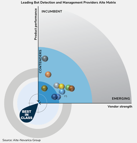 봇 부문 최고의 솔루션 제공기업으로써 F5는 봇과 위험감지 기능을 통합해 광범위한 자동화 공격으로부터 조직을 안전하게 보호하는 동시에 사용자와의 마찰을 줄여서 착한 봇이 지속적으로 활동할 수 있도록 허용한다. 에이트 노바리카 그룹은 금융 서비스 연구와 자문 서비스 제공 기업으로, 최근 '에이트 매트릭스: 최고의 봇 탐지, 관리 제공기업(Aite Matrix: Leading Bot Detection and Management Providers)'이라는 보고서를 발표하면서 F5를 봇 매니지먼트 부문 최고의 기업으로 선정했다.