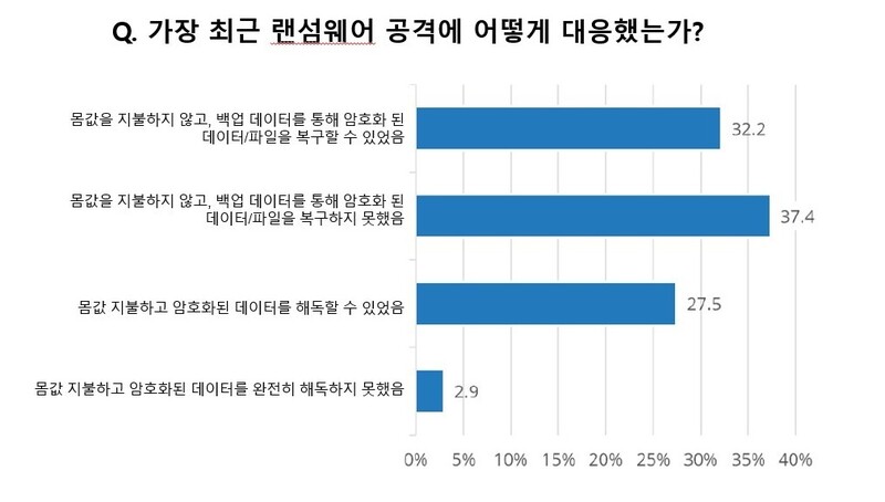 몸값을 지불하지 않는 선택지도 리스크가 존재한다. IDC 조사에 따르면 응답자의 약 32%는 백업 파일에서 암호화된 데이터를 복구할 수 있었다. 현재 많은 백업 전문 기업이 빠르고 안정적인 방법으로 데이터를 복구하는 도구와 솔루션을 제공하기 때문에 자체적으로 데이터를 복구하는 사례는 점차 많아질 것으로 보인다.