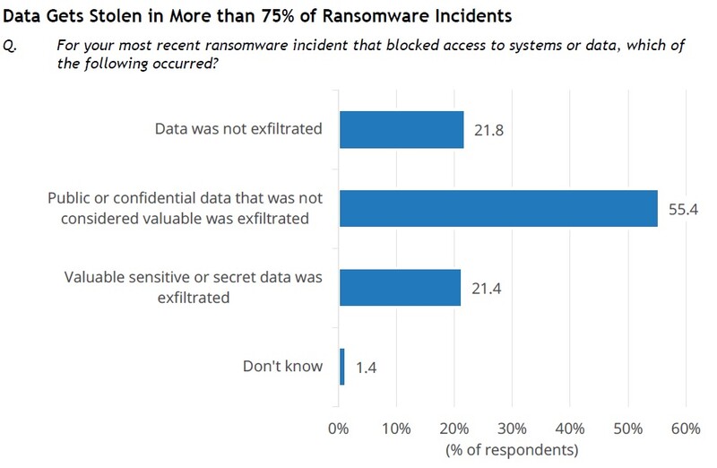 랜섬웨어는 주로 백업 데이터를 삭제하기 때문에 안전한 백업 데이터 확보는 매우 중요하다. IDC 조사에 따르면, 응답자의 절반(50%)은 랜섬웨어 공격자가 백업 데이터를 표적으로 삼았으며 23%는 랜섬웨어 공격으로 백업 데이터를 잃었다고 답했다. 랜섬웨어 공격을 경험한 응답자의 75% 이상이 데이터를 탈취당했다고 응답한 만큼 데이터 유출 또한 심각한 문제다. 백서는 이런 랜섬웨어 공격에 대응하기 위해 예방과 탐지, 복구 모두가 통합된 사이버 보안 전략을 세워야 한다고 밝혔다.
