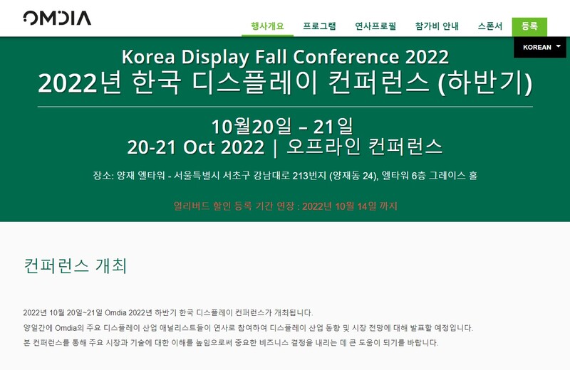 인포마테크(Informa Tech)의 기술 연구, 자문 그룹인 옴디아가 ‘2022년 하반기 한국 디스플레이 컨퍼런스(Korea Display Fall Conference 2022)’를 양재 엘타워에서 개최한다고 밝혔다. 이번 행사는 전 세계 디스플레이 산업 동향과 시장 전망을 주제로 양재 엘타워에서 10월 20, 21일 양일간 진행된다.