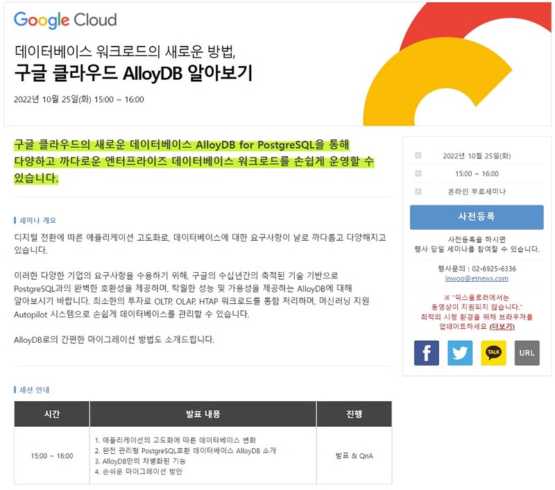 이번 웨비나에서는 애플리케이션의 고도화에 따른 데이터베이스의 변화, 완전 관리형 PostgreSQL과 호환되는 데이터베이스인 AlloyDB의 소개와 차별화된 기능과 함께 활용 전략을 소개한다. 또한 많은 기업에서 고민하고 있는 마이그레이션에 대해서 AlloyDB를 통한 간편한 마이그레이션 방법도 소개한다.