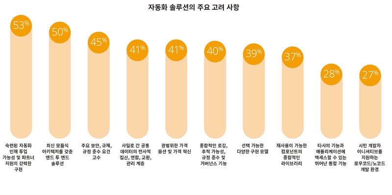 한편, 많은 한국 조직이 자동화 확대 시 직면한 3대 과제 중 하나로 자동화 기술과 인재 부족(53%)을 꼽으며 인재 부족 현상이 중요한 당면과제가 되고 있음을 나타냈다. 이외에도 57%가 자동화 솔루션 채택 시 숙련된 자동화 인재의 유무, 자동화 솔루션 파트너 기업의 지원 여부가 핵심이라고 답했으며, 50%는 시민 개발자 이니셔티브를 실행하기 위해 로우코드/노코드 개발 환경을 모색한다고 답했다.