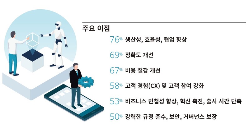 2020년과 2021년 사이 아시아 태평양과 일본 전역 응답 조직의 67%, 한국 조직은 5 중 4군데(83%)에서 자동화 부문에 대한 투자가 증가하고 있다. 한국의 경우, 자동화 구현을 위한 비즈니스 최우선순위로 운영 효율성 향상(67%), 프로세스 간소화(57%), 효과적인 고객 경험과 여정 전달(57%)을 꼽고 있다.