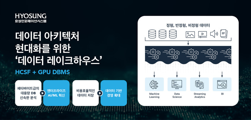 데이터 인프라와 솔루션 전문기업 효성인포메이션시스템이 대용량 데이터의 신속한 분석과 엔터프라이즈 AI/ML 혁신을 위한 ‘데이터 레이크하우스(Data Lakehouse)’ 구현을 통해 고객들의 데이터 기반 경영을 적극 지원해 나가겠다고 밝혔다.