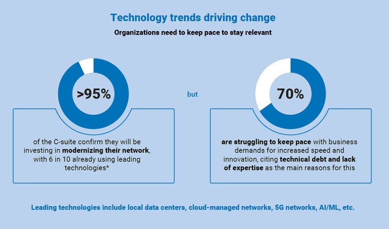 그 결과 네트워크 현대화의 새로운 시대가 열렸으며, 대다수 경영진은 네트워크를 현대화해 비즈니스 성장을 뒷받침하고(90%), AIOps(AI for IT Operarion)을 지원(91%)하고자 한다.