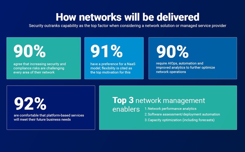 응답자들은 가장 큰 우려 사항으로 비용보다 보안, 현대화, 네트워크 공급자의 전체 서비스 제품군에 대한 액세스를 꼽았다. 네트워크 관리 측면에서는 고위 경영진의 90% 이상이 서비스형 네트워크 모델을 선호한다고 답했다.