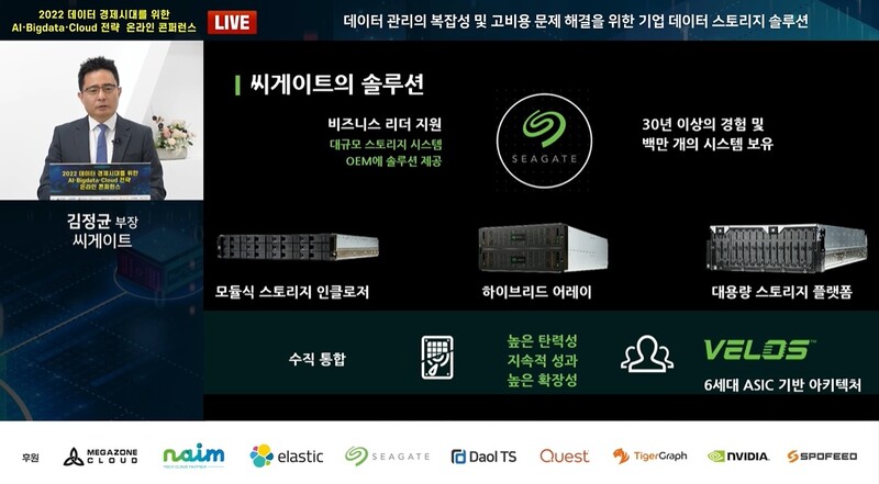 씨게이트의 김정균 부장이 ‘데이터 관리의 복잡성 및 고비용 문제 해결을 위한 기업 데이터 스토리지 솔루션’에 대해서 씨게이트가 제공하는 스토리지 솔루션과 다양한 시스템, 대용량 클라우드 스토리지 플랫폼인 라이브(Lyve)등의 개방적이고 유연한 아키텍처 등을 소개한다. 더불어 이를 통해 기업들이 얻을 수 있는 혜택까지 알려준다.
