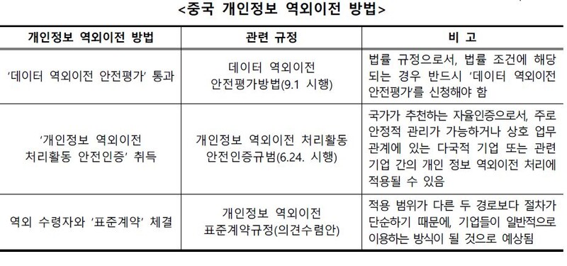 아울러, 중국 정부는 개인정보와 데이터 역외이전 시 처리 규모, 중요도 등으로 분류해 역외이전 규제방법과 절차를 각각 달리하고 있어 중국 소재 한국기업들의 준법경영에 어려움이 가중되고 있다.