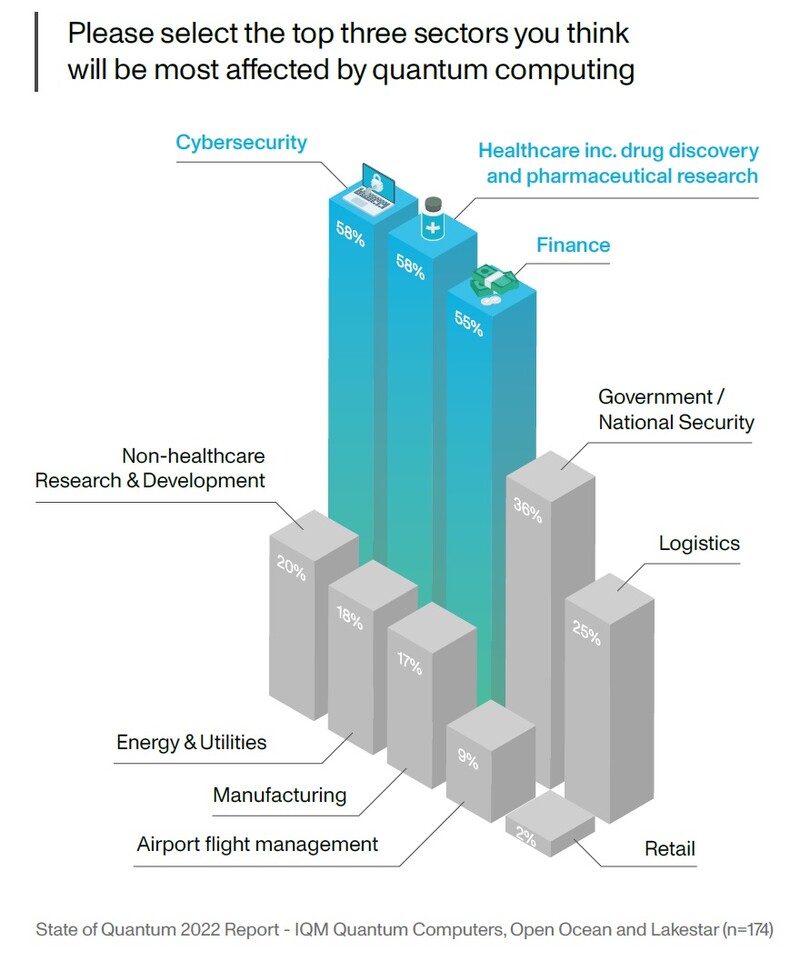양자 컴퓨팅 업계의 인재 부족과 하드웨어 비용으로 인해 발생하는 문제에도 불구하고 상당한 비율(33%)의 기업이 최소한 이 기술을 다양한 애플리케이션에 특화할 수 있다고 내다보고 있다. 이런 기업들은 양자 컴퓨팅이 앞으로 몇 년에 걸쳐 큰 도전과 변화를 일으키고 특히 사이버 보안, 금융, 제약 연구 등 의료의 세 가지 주요 분야에서 혁신을 주도할 것이라고 생각하고 있다.