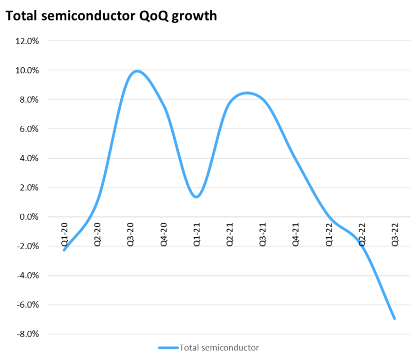옴디아(Omdia)의 반도체 경쟁력 평가 도구(Competitive Landscape Tool, CLT)에 따르면 반도체 시장은 2020년 초에 시작된 코로나19 팬데믹 기간에 이례적으로 연속적인 수익 성장을 보였다. 이 기간에는 8분기 연속 수익 성장을 기록했다. 하지만 지난 두 분기 동안 시장이 위축되기 시작했다. 2022년 3분기 반도체 수익은 1470억 달러로, 이전 분기의 1580억 달러보다 7% 감소했다.