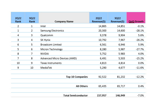 메모리 분야 중심 3사인 삼성전자, SK하이닉스, 마이크론 테크놀로지는 모두 한 자리씩 순위가 밀려났다. 주요 메모리 공급업체는 2022년 3분기에 100억 달러 넘는 반도체 수익 감소를 기록했고, 다른 업체들도 마찬가지로 어려움을 겪었다. AMD는 PC 수요 둔화와 재고 감소로 인해 수익이 감소했으며, 이는 이전 분기 인텔의 시장 상황과 동일하다.