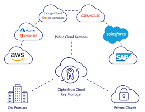 사이퍼트러스트 클라우드 키 매니저는 하이브리드와 멀티 클라우드 환경 전반에 걸쳐 다양한 인터페이스를 통합하는 ‘단일 창(single pane of glass)’ 솔루션으로, 중앙화 된 시각과 더불어 클라우드에 데이터 주권 통제 기능을 제공하고 모든 클라우드 환경에서 고객 선택권을 부여하며, 증가하는 컴플라이언스 환경 전반에서 리스크 관리를 지원한다.