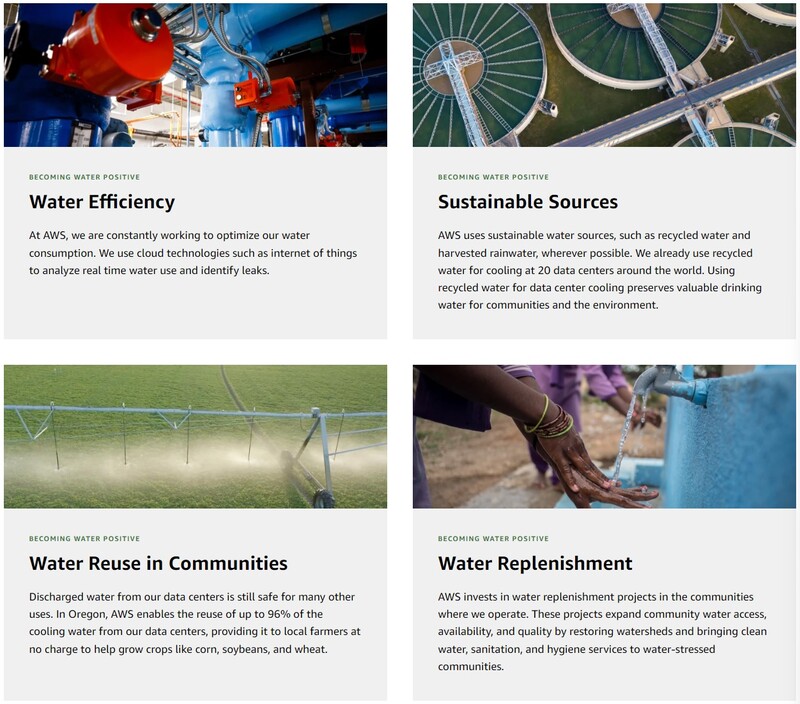 세번째로 데이터센터에서 물 사용을 극대화한 후에도, 사용된 물은 다른 많은 용도에 사용해도 안전하며 AWS는 이를 지역사회에 되돌려줄 수 있는 더 많은 방법을 찾고 있다. 오리건주에서 AWS는 데이터센터의 냉각수 중 최대 96%를 지역 농부들에게 무료로 제공해, 옥수수, 대두, 밀과 같은 농작물 관개에 사용되고 있다.